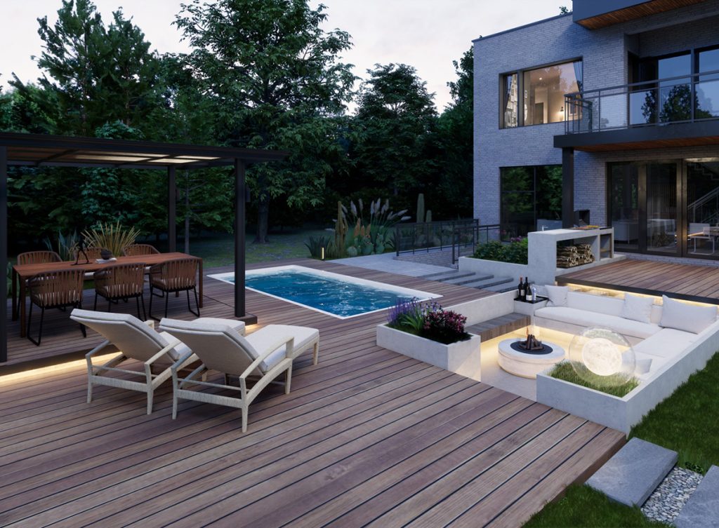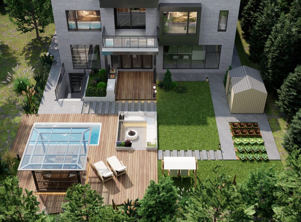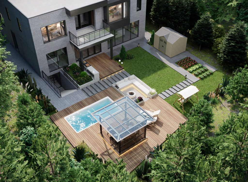 露天按摩浴缸延伸了景观视野,配套的烧烤区与跳动的炉火营造出温馨宜人的氛围。玻璃茶室作为家人朋友聚会的场所,辅以喷泉水景与小菜园,极大地丰富了庭院生活的趣味性。