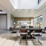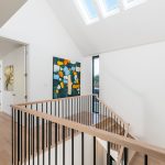 原有的房产是战后带阁楼的平房,现有的设计保留了 50% 的外墙,并在后面和二楼加建。在原有墙壁上添加墙垛,将一楼天花板高度增加到 9 英尺。大面积窗户和天窗让自然光进入,照亮了内部空间。 27英尺高的大教堂天花板中庭营造出令人惊叹的视觉冲击力,让小房子感觉宽敞和开放。