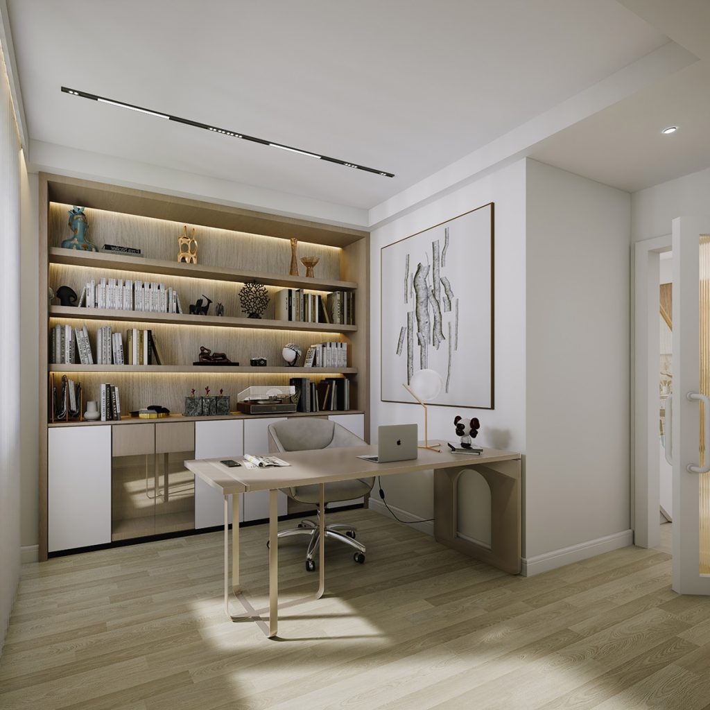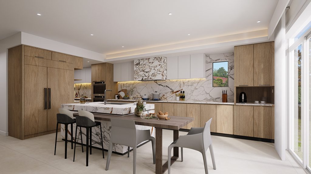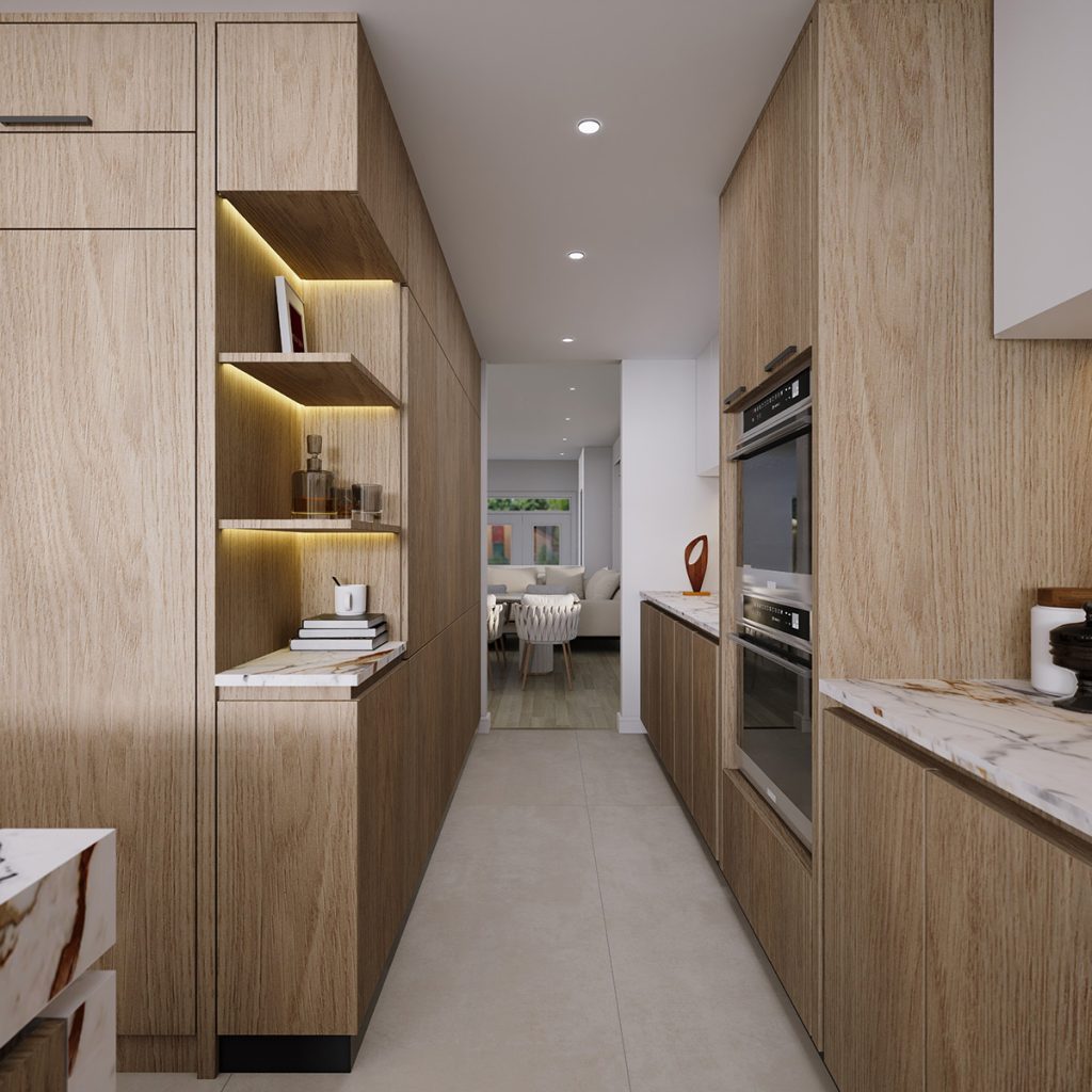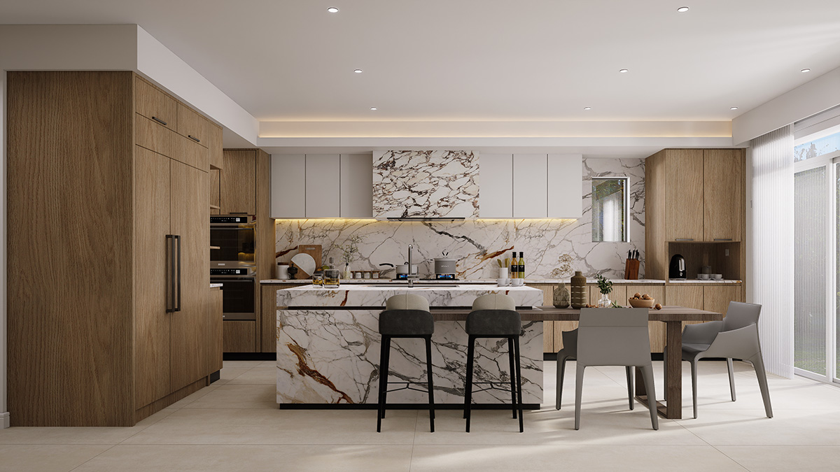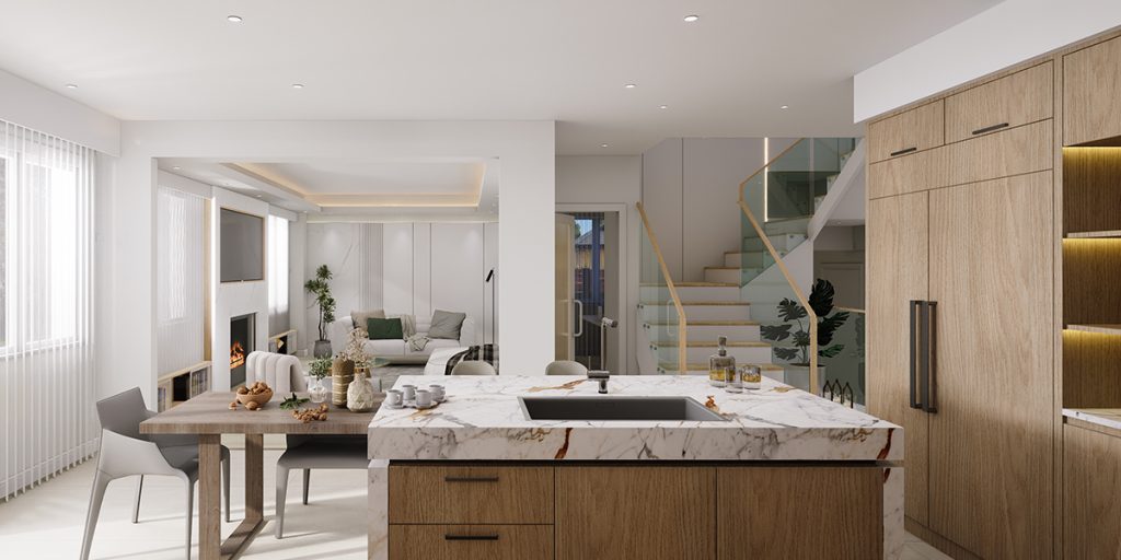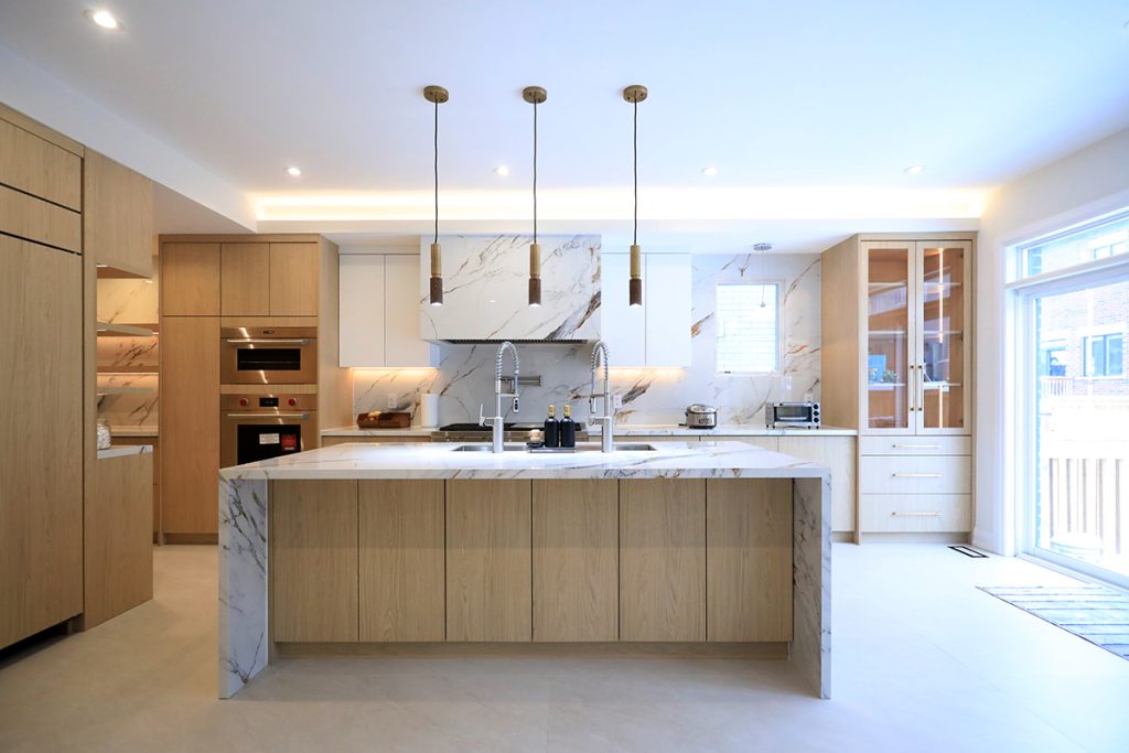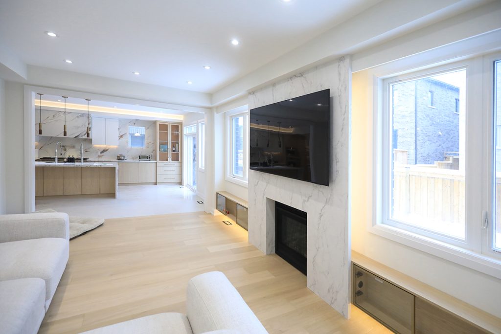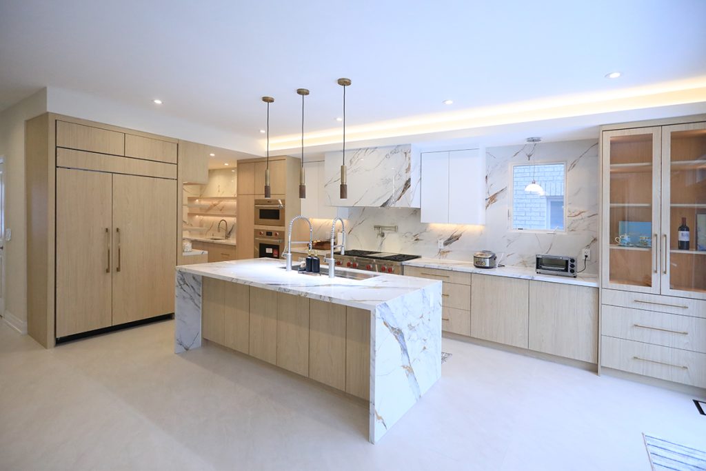 The renovation includes the replacement of all existing wood flooring with large-format sintered stone tiles installed on the ground floor. The kitchen features sintered stone countertops and backsplash, complemented by a combination of wood-textured and off-white cabinetry, along with a set of glass display doors that add visual interest.