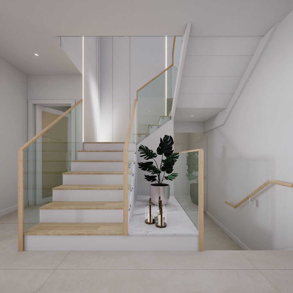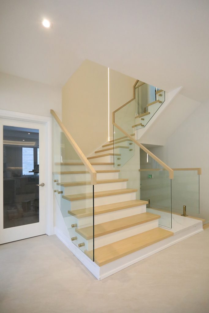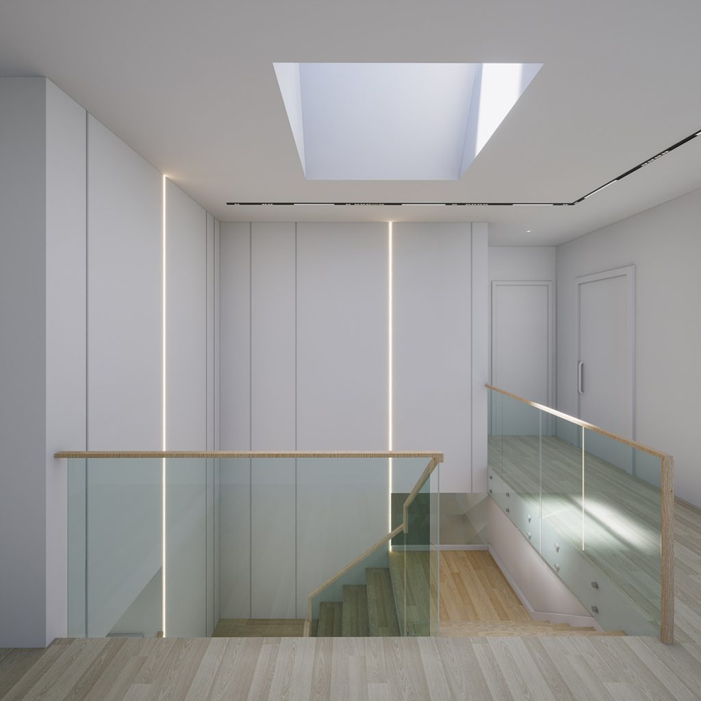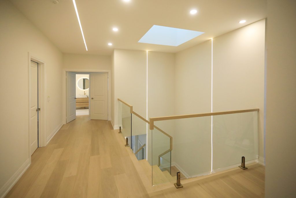 A new skylight is introduced above the stairway to enhance natural light, and the existing wood stair railing was replaced with a glass guard. A seamless door is added to the primary bedroom. Together, these upgrades transform the interior into a warm, modern living environment.