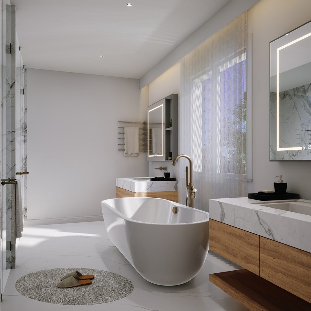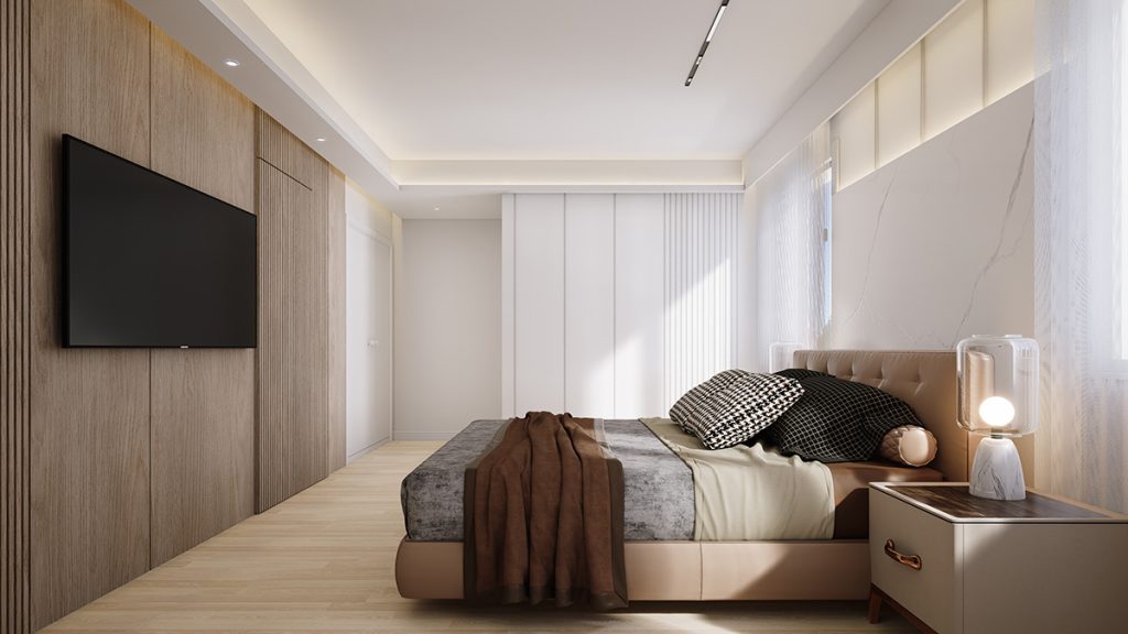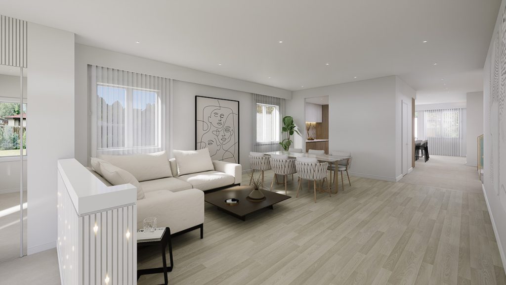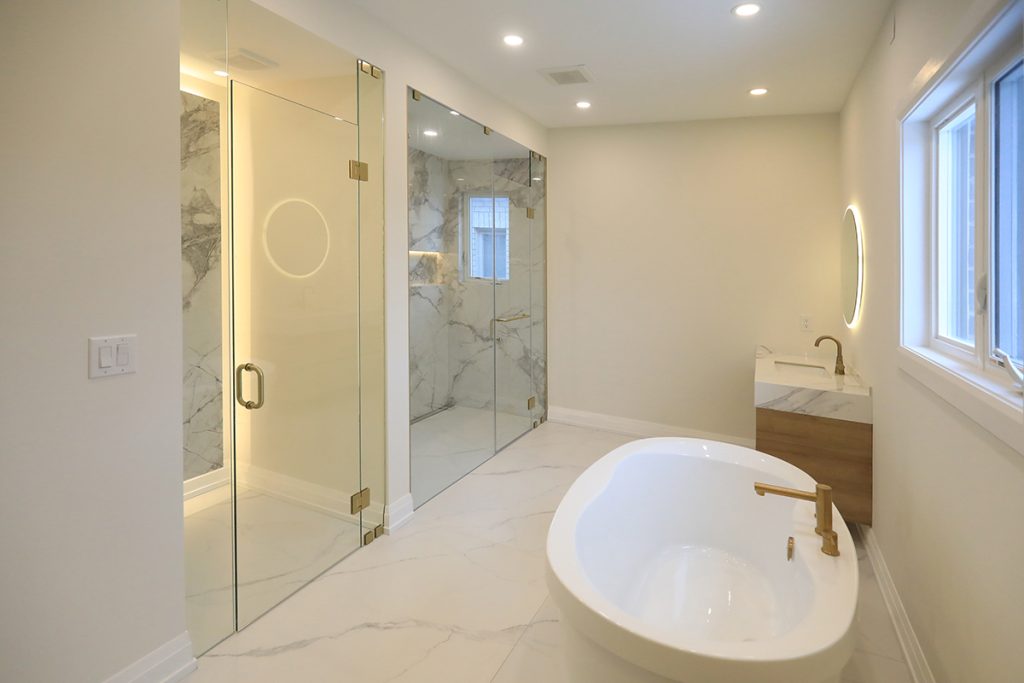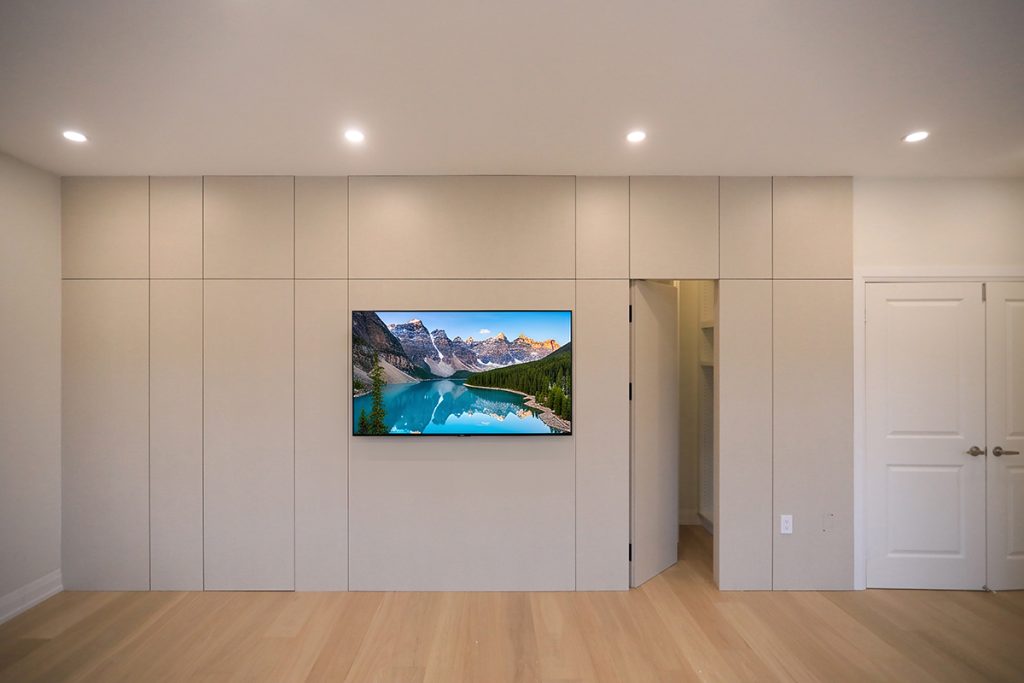 A new skylight is introduced above the stairway to enhance natural light, and the existing wood stair railing was replaced with a glass guard. A seamless door is added to the primary bedroom. Together, these upgrades transform the interior into a warm, modern living environment.